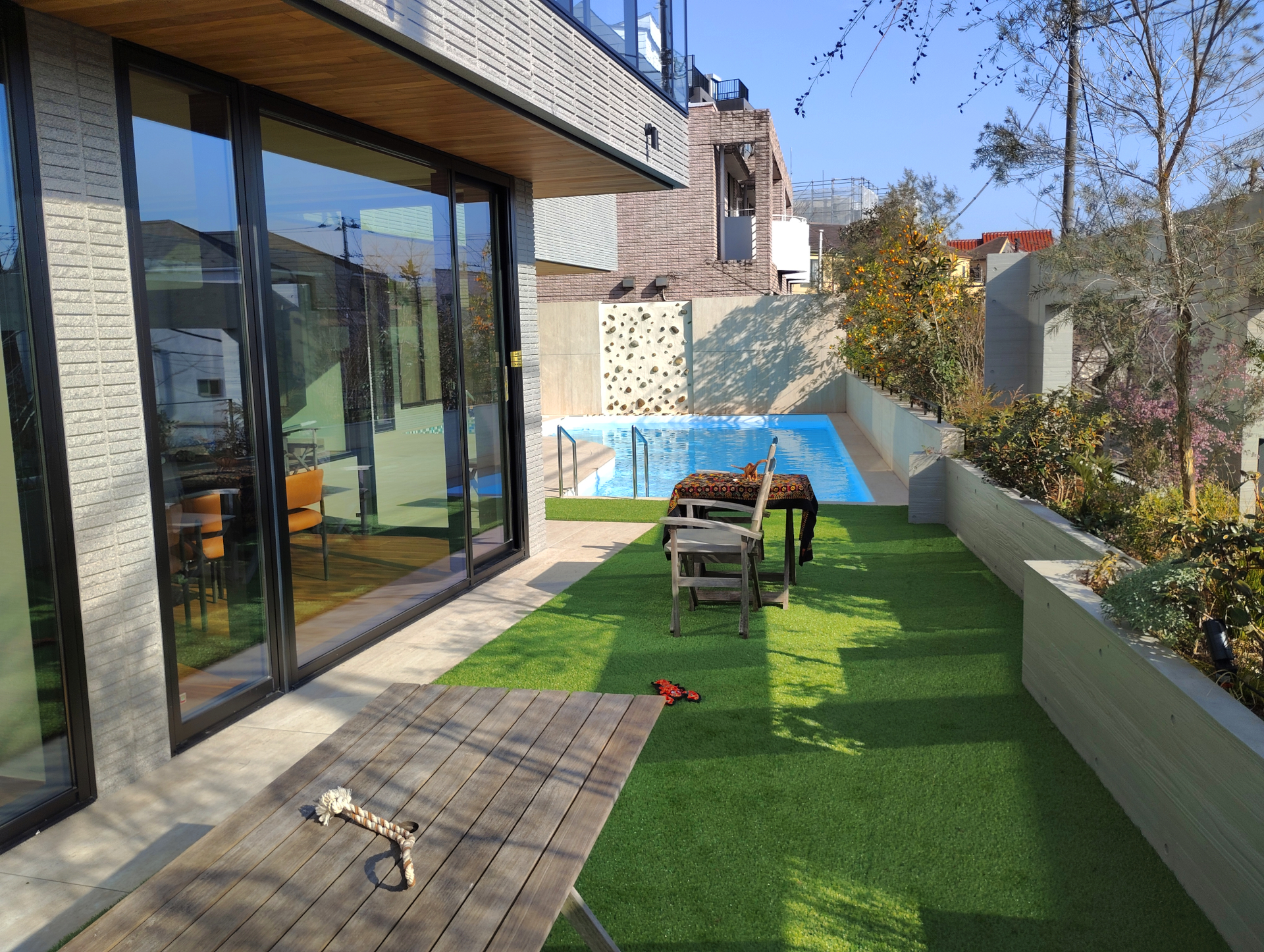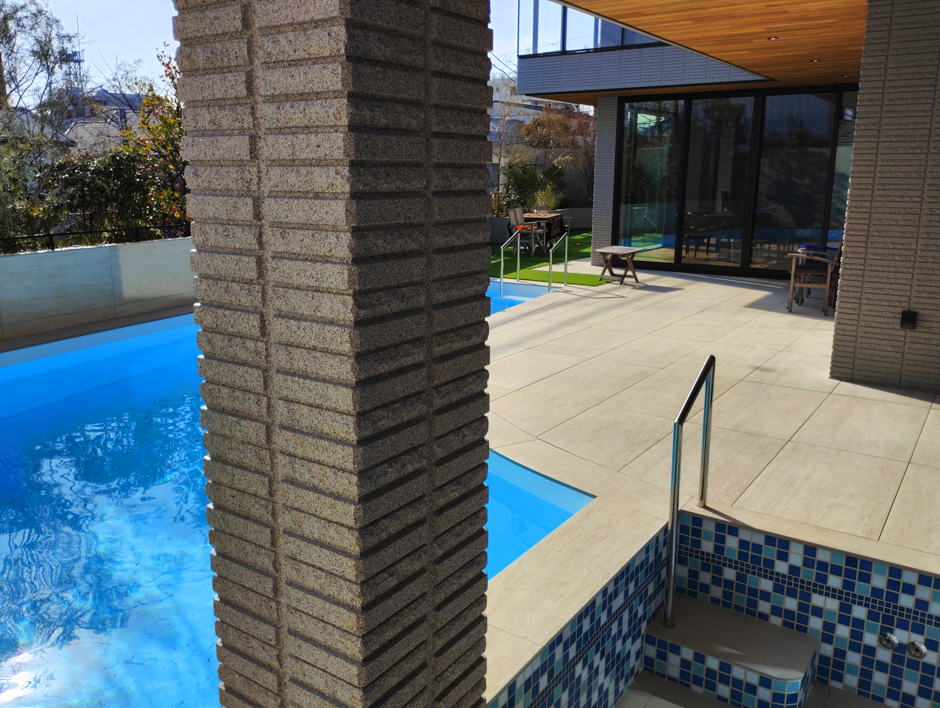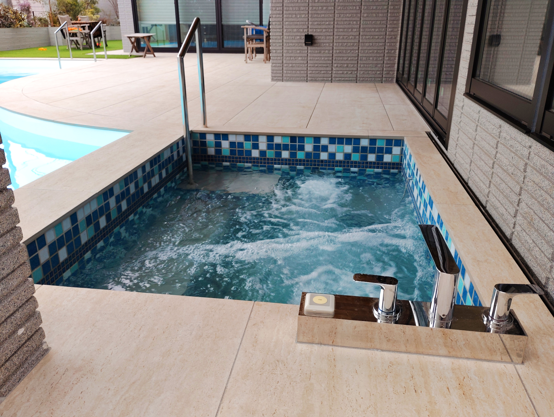 インフィニティプール手前側は水深の浅い水盤となっていて、お子様でも安心して水遊びが出来るように配慮しました。